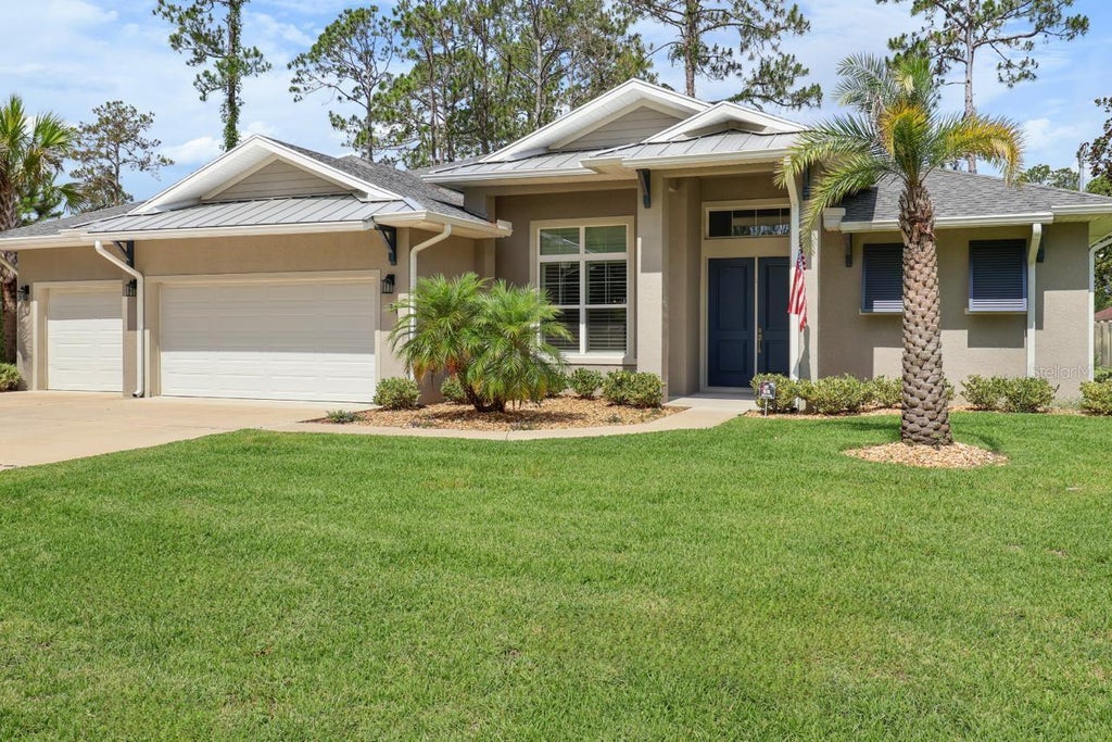 Step into a home where every corner tells a story of comfort and elegance. Nestled in the serene Palm Coast neighborhood, this 3-bedroom, 2-bathroom residence offers a harmonious blend of modern design and thoughtful details. As you enter, you're greeted by an expansive great room with soaring 12-foot ceilings, creating an open and airy ambiance. The heart of the home is its chef-inspired kitchen, featuring rich maple cabinetry, a built-in pantry, and sleek natural stone countertops. Upgraded appliances and an oversized breakfast bar make this space perfect for both everyday meals and entertaining guests. The master suite is a true retreat, offering privacy and tranquility. Two generous walk-in closets with sliding pocket doors provide ample storage, while the en-suite bathroom boasts double vanities and a beautifully tiled walk-in shower. Step outside to the covered lanai, a screened-in oasis ideal for enjoying Florida's pleasant weather year-round. The space is enhanced with a summer kitchen, complete with a sink, built-in stainless steel cabinets, and a bar refrigerator—perfect for alfresco dining and entertaining. Additional features include hurricane-ready shuttered windows, motorized electronic blinds for effortless light control, and an interior laundry room equipped with a utility sink. The expansive 3-car garage, finished with custom epoxy floors, offers both functionality and style. Located in the desirable Palm Coast Sec 27 Blk 58 & 59 subdivision, this home combines modern design with practical features, making it a perfect choice for comfortable living.