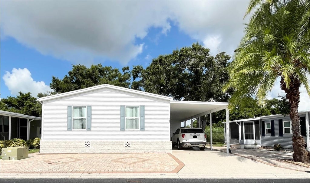 Welcome to your private oasis in the ONLY Resident Owned Park in the City limits of Sarasota!! Additionally this home is positioned on the West perimeter fence and is close to the resident only gate. This lovely 1,620sf turnkey furnished 2 Bedroom/ 2 Bath with a large den(3rd bedroom) is a SPLIT PLAN Palm Harbor home and has many upgrades and luxury furnishings. The home has exquisite curb appeal with decorative pavers, a stone paver knee wall around the perimeter, epoxy driveway and stone steps leading into all 3 entry doors. Upon entering the first upgrade you will notice is the entire home has drywall and crown molding throughout. The formal dining area features a beautiful oval table and server. The spacious living room has a high tray ceiling and large accent windows allowing for natural light. To your right enter into the large kitchen featuring ample cooking space with the sprawling stone bordered counters and backsplash. High cabinets and a step in pantry will meet all your storage needs. Just off the kitchen is a private breakfast/dinette space with a round table with seating for 4 and a decorative bench, a nook area for your laptop and documents and the washer/dryer area. The primary suite features a luxury king bed set and an en suite bath with a step in shower and additional walk in closet. Across the other side of the home is the beautifully furnished guest bedroom, a full sized den that could be used as a 3rd bedroom and the guest bath with a tub/shower. There is access to the storage shed inside the home just off the dinette space and thru the carport. Other upgrades include: Shingle Roof 11/2024 and HVAC in 2020. The bedrooms and living area have all been outfitted with nice ceiling fans/lights. Note: Insurance carriers were offering a 10% discount on Palm Harbor built homes - so be sure to ask when getting quotes for insurance. The gated 90 acre community boasts a low maintenance fee with its vast amenities starting with the spacious Clubhouse outfitted with a full commercial cook kitchen, event stage, audio/visual, dance floor, state of the art fitness room, activities hall, library with books/movies/puzzles and a pool table. Outside recreation includes an extra large heated pool with a handicap ramp, a spacious kidney shaped hot tub, ample umbrella tables and lounge chairs and updated shower rooms. Oak trees shade the beautiful park area, picnic tables and a community grill. Additional amenities to enjoy are the community putt putt course, bocce ball, ping pong, horseshoes and corn hole. Oakwood Manor is a vibrant community with numerous social events and activities. Conveniently located adjacent to Legacy Trail and 12 newer pickle ball courts. Just a short drive to our crystal sand beaches, downtown area, the marina, fishing pier, local golf courses, shopping, variety of restaurants, the museum, SRQ airport, SMH and Doctors hospitals. Please note that Oakwood is a 55+, no pet, no motorcycle Park.