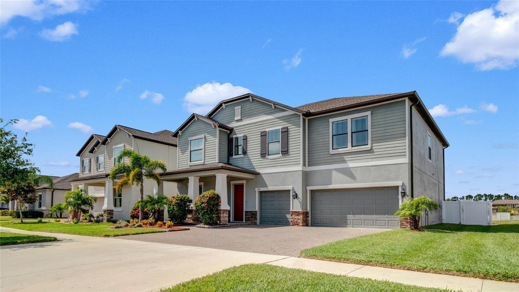 Great opportunity to own this exceptional home with a gorgeous water view in the serene, family-friendly South Fork Community. As you arrive, it boasts curb appeal with a charming front porch, surrounded by meticulously landscaped grounds. An extra-large paver driveway and walkway invite you inside. As you step into this spacious home, you'll immediately notice it was thoughtfully designed across two levels for living, working, and entertaining! Its light-filled layout features 6 bedrooms and 3 full bathrooms. Includes an upstairs loft that adds a HUGE BONUS ROOM, game/movie room or flex space. The well-designed *OPEN FLOOR PLAN* centers around an impressive great dining/family/kitchen room with water view, perfect for casual breakfast or entertaining guests. The 10-FOOT CEILINGS throughout the home provide an airy, and spacious feel. NO CARPET on either floor, TILE floors on all common, formal areas, and LAMINATE in the rest of the home. The Kitchen features beautiful 42-INCH CABINETS with *Granite Counters*, *Stainless Steel Appliances*, *Large Kitchen Island* for a pleasant casual dining experience, modern tile backsplash, a WALK IN PANTRY closet, and a set of additional cabinets and workspace. It also includes modern lighting fixtures and an accent wall towards dining room, and in the bonus room. The bedrooms are equally spacious, with the fifth and sixth bedrooms perfectly suited for use as an office, or mother in law ensuite, are located on the first floor sharing a bathroom. Not only is this home beautiful, but it's also energy efficient, and it features whole house WATER SOFTENER SYSTEM and REVERSE OSMOSIS water filter w/ built in faucet by the kitchen sink. UV lights installed in both AC units, and a NEST thermostat on first floor that can be controlled from your phone. A VERY SPACIOUS MASTER SUITE features a LARGE BATHROOM with a great sized tub and separate shower enclosure, DUAL SINKS with GRANITE COUNTERTOPS, and a separate CUSTOMIZED BUILT-IN WALK-IN CLOSET. Enjoy the convenience of dedicated LAUNDRY ROOM with LG AI WASHER and DRYER and Upper Storage Cabinets. Home includes a large FENCED IN YARD perfect for your fur babies, entertaining and BBQ’s. This outdoor space features an extended PAVER PATIO that is both peaceful and private, a perfect way to enjoy Florida’s year-round sunshine! This home also includes a three-car garage, that continues into a 6 car capacity driveway. Garage has a separate small room for storage, along with added OVER-HEAD HEAVY DUTY RACKS for additional space, plus a utility sink. ALL wonderful extras to have! Located walking distance to the community RESORT STYLE POOL and amenities, and strategically located near shopping, dining and entertainment. World famous Florida beaches are about an hour away. This home offers the perfect blend of luxury, comfort, and community living; Don't miss out on the opportunity to make this exceptional property your own. Make your appointment to see it today!!