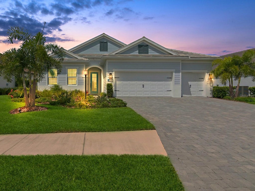 Welcome to Indigo in Lakewood Ranch, a thoughtfully crafted gated community built by Neal Homes. The popular Silver Sky II model offers 4 bedrooms, 3 baths, den/bonus room and a sparkling pool & spa with outdoor kitchen. This beautifully designed home effortlessly combines modern farmhouse charm with comfort and sophistication. Custom woodwork accents and wide plank luxury vinyl flooring throughout create an inviting warmth and ambiance from the moment you step into the grand entryway. As you enter the open-concept living and kitchen area, you'll be welcomed by a beautiful custom shiplap wall, faux brick accent wall and a wood beam tray ceiling. The kitchen features a spacious island with gleaming quartz countertops, complemented by stainless steel Café appliances and a gas range, making it ideal for even the most discerning chef. The aesthetic continues into the tranquil primary suite with board and batten accent wall and tray ceiling with custom wood inlays. This home features one of the community’s larger private pools and spas, complete with a sun shelf, expertly crafted by Waterscapes—ideal for enjoying sunny pool days. The lanai is thoughtfully designed for outdoor living, complete with a custom outdoor kitchen featuring a stone facade, grill and beverage cooler. Hurricane-impact glass throughout offers year-round peace of mind. The spacious laundry room offers extra storage with upper and lower cabinetry and a stylish tile backsplash, along with a convenient utility sink and ample counter space for folding and organizing. The Indigo community is gated and offers resort-style living at your fingertips, including a heated community pool, pickleball courts, a 24-hour gym, playground and clubhouse perfect for hosting gatherings.