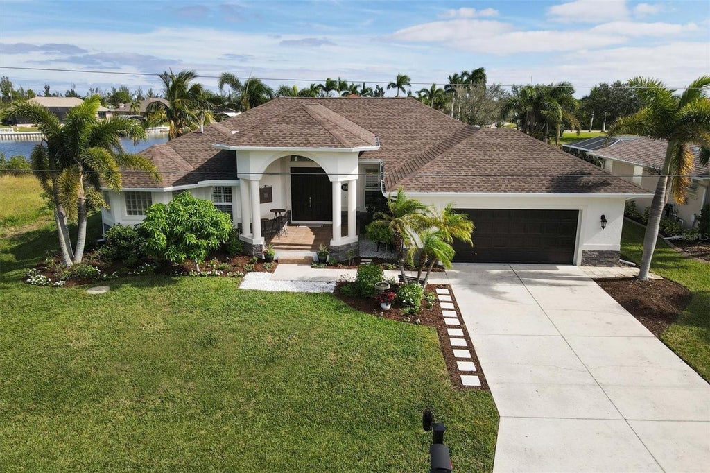 Back on Market – Buyer’s Financing Fell Through! Amazing price for this Updated Gulf Access Pool Home with 10K Boat Lift + Possible Assumable VA Loan at 2.25%! Step into Florida waterfront living at its finest with this meticulously maintained 4-bedroom plus den retreat in South Gulf Cove—featuring a NEW ROOF (2023), NEWER A/C (2020), Refinished HEATED SALTWATER POOL and Deck, New Saltwater Chlorinator, New Pool Pump & Timer, Fresh Interior/Exterior Paint, New Lanai Screens, and Brand New Boat Lift Canopy! Best of all? NO STORM DAMAGE! Enjoy panoramic intersecting canal views from your oversized lot surrounded by royal palms and fruit trees with full irrigation. Boaters and anglers will love the 10,000 lb covered boat lift and brackish water dock offering both saltwater and freshwater fishing—plus QUICK access to Charlotte Harbor, the Intracoastal Waterway, and Gulf of Mexico. Inside, a grand double-door entry leads to an open-concept floor plan with sliding glass doors on both sides of the pool for seamless indoor-outdoor living. The spacious Great Room boasts tray ceilings, abundant natural light, and flows effortlessly into the gourmet kitchen with solid wood maple cabinets, granite counters, double oven, and a cozy breakfast nook featuring an aquarium window overlooking the water. The master suite is a private retreat with direct lanai access, his and her closets, and a spa-like bath with double sinks, garden tub, and Roman walk-through shower. Generously sized guest bedrooms and two well-appointed baths offer plenty of space for visitors. A large laundry room connects to the OVERSIZED 2.5 CAR GARAGE (25x22 - 550 Sq Ft) and includes extra storage, counter space, and a deep sink. No HOA required as it is a voluntary association. VA buyers—ask about the assumable 2.25% interest rate! This is the rare combination of updates, location, and waterfront lifestyle you’ve been waiting for. Schedule your private showing today—paradise is calling!