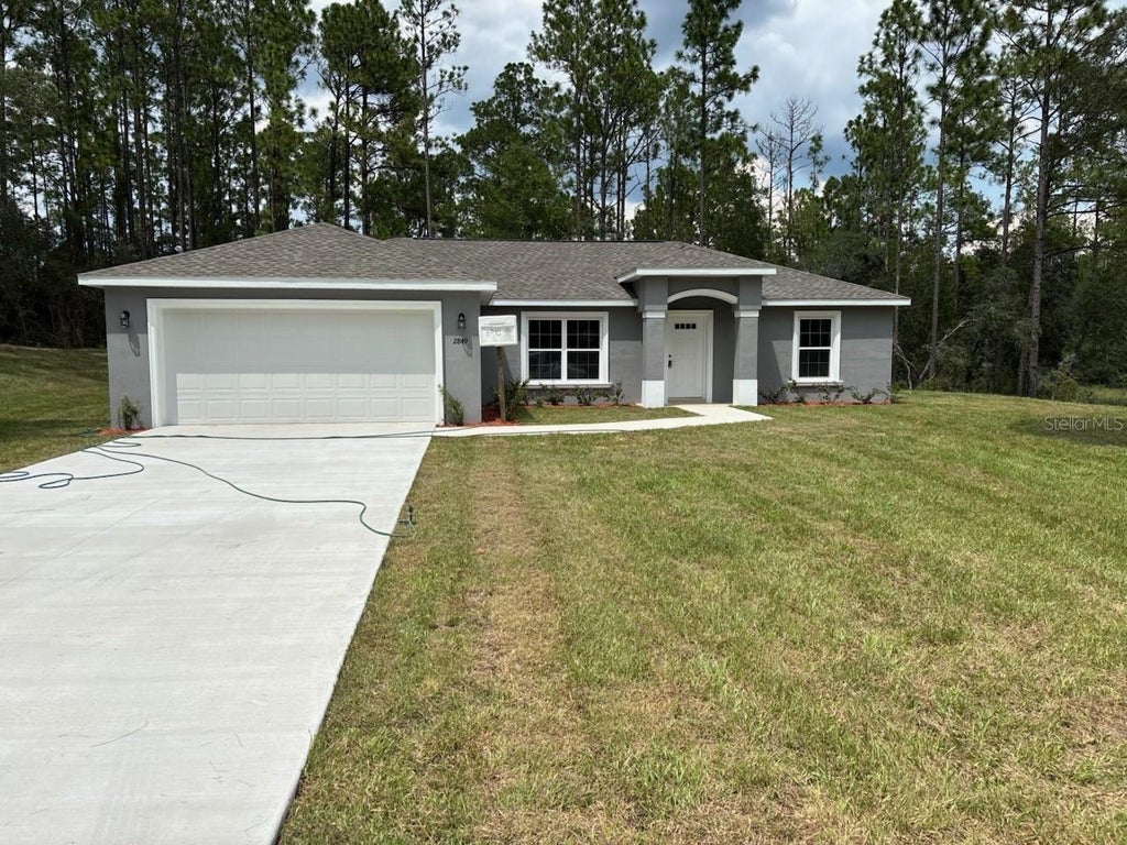 NEW CONSTRUCTION. MOVE-IN READY! This stunning Isla Bella Model offers 3 bedrooms, 2 bathrooms, and 1,530 square feet of comfortable living space on a spacious 0.44-acre corner lot with minimal traffic. The open layout features concrete block construction, a 30-year architectural shingle roof, energy-efficient double-pane windows, and a vaulted ceiling in the living room. The new, larger kitchen is a showpiece with a deluxe cabinet package, soft-close white shaker cabinets, granite countertops, a pantry, stainless steel appliances, and a subway tile backsplash. The master suite is beautifully designed with a tray ceiling accented by crown molding, a large walk-in closet, and a luxurious bathroom that includes an oversized 5x5 walk-in shower with dual shower heads, a privacy window, and two linen closets. The guest bath is equally stylish with an upgraded marble-look tile and a tub/shower combo. Throughout the home, you will find luxury vinyl plank flooring, a laundry room with an upgraded cabinet package, and modern finishes. Outdoor living is easy with a covered patio and an attached 2-car garage complete with opener and remotes. Built with quality in mind, this home comes with a 10-year structural warranty and is located in Flood Zone X, which means it is high and dry, with no flood insurance required. Best of all, there are no HOA fees, giving you more freedom to enjoy your property.