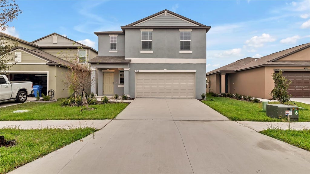 2872 Silver Scallop Loop, located in Wimauma, Florida, is a newly constructed two-story home in the Berry Bay community. It features 4 bedrooms, 2.5 bathrooms, and a total living space of 1,870 square feet. The open floor plan on the first floor seamlessly connects the kitchen, dining, and living areas, making it perfect for entertaining. Upstairs, you'll find a versatile loft area and the bedrooms, including a spacious owner's suite with a private bathroom. The property is part of a master-planned community offering amenities like a swimming pool, clubhouse, playground, dog park, and sports courts. It is close to local schools, dining options, and outdoor attractions such as the Little Manatee River State Park, which offers horseback riding and kayaking opportunities. Tampa Bay and Bahia Beach are also nearby, providing additional recreation options. The home includes modern appliances, central heating and air conditioning, and a two-car garage.