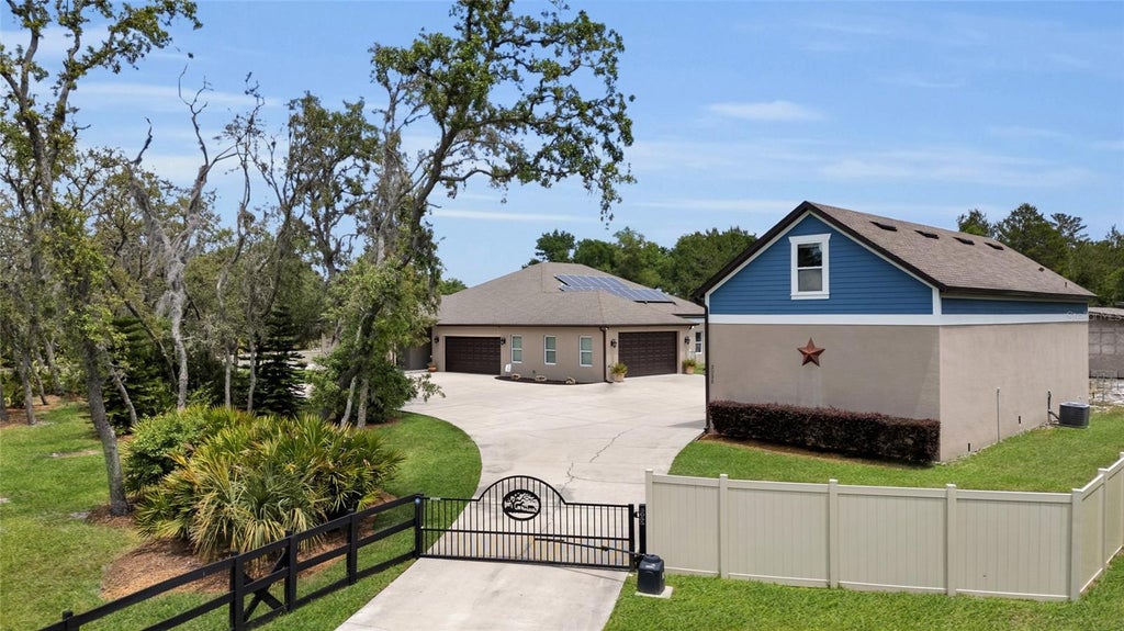 Your Dream Retreat Awaits in Mount Dora! Prepare to be captivated by this stunning 2017-built estate now available UNDER APPRAISED VALUE!!!! This isn't just a home; it's a private sanctuary designed for both ultimate relaxation and endless entertainment. Located on over two acres of lush, fully fenced land, your private oasis begins the moment you pass through the private electronic gate. The heart of the home immediately welcomes you with a breathtaking view of the sparkling, heated saltwater pool and spa. Inside, the spacious family room flows seamlessly into a luxurious kitchen, where you'll find top-of-the-line stainless steel appliances, gorgeous granite counters, and a massive island perfect for casual gatherings. This home offers incredible flexibility with four bedrooms, three-and-a-half baths, and a versatile multi-use wing. Imagine your new home office, a dedicated craft space, or a home gym—the possibilities are endless! Need more space? This wing could easily be converted into three additional bedrooms, bringing the total to a remarkable six. The primary suite is a peaceful haven, featuring elegant farm doors leading to the luxury ensuite bath and a walk-in closet so magnificent it's a room in itself. True magic extends beyond the main house. A massive 1,320 sq ft detached workshop, with AC, offers a loft bedroom and a full bathroom, presenting endless opportunities for hobbies, guests, or a home business. Car collectors will delight in the garage space for up to four vehicles in the workshop AND 4 car garage attached to the main home, YES, 8 CAR Potential. The property also includes covered RV and boat parking with a 50-AMP hookup and eight pole barns, all powered by a Generac system with two 250-gallon propane tanks. Adding exceptional value, the solar panels on the property are completely paid off, giving you incredible energy savings and peace of mind. Indulge in a life of ease and sophistication just minutes from Mount Dora's charming downtown, vibrant cultural scene, excellent schools, and top-rated hospitals. This is more than a home—it's a lifestyle you deserve. Don't miss this opportunity to own your private paradise!