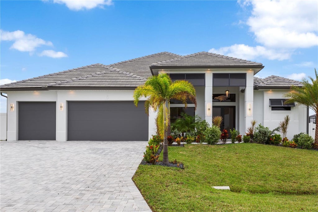 PRIME LOCATION near future SEVEN ISLANDS WATERFRONT COMMUNITY, featuring planned marinas, parks, dining & resort-style amenities. Incredible POTENTIAL & RISING VALUES make this a SMART EARLY INVESTMENT OPPORTUNITY w/ NO FLOOD INSURANCE REQUIRED & 1-YEAR BUILDER WARRANTY! Immerse yourself in the EPITOME of CONTEMPORARY LUXURY, INVITING YOU to claim YOUR slice of PARADISE in CAPE CORAL, SOUTHWEST FLORIDA! This STUNNING NEW-BUILT property is ready to embrace YOU as its NEW OWNER, offering exquisite blend of MODERN DESIGN & COMFORT! Wake up to DELIGHTFUL spectacle of SUNRISE VIEWS from BRIGHT & EXPANSIVE 2,420 sq ft floorplan w/ sleek SPANISH PORCELAIN TILE FLOORING throughout. STEP INSIDE to DISCOVER SOPHISTICATION in 3 BEDROOMS plus a DEN (MAKE IT 4!!!) & 3.5 BATHS, where designer lamps, lights & modern fans add touch of ELEGANCE at every turn! Walk through FRONT PORCH & enter DOUBLE FRONT DOORS, you're greeted by GRAND FOYER adorned w/ ACOUSTIC PANELS EMBEDDED w/ LED TRACK LIGHTS, setting stage for TRULY CAPTIVATING AMBIANCE! Indulge in the WARMTH OF HOME beneath the 16-ft COVE CEILING adorned w/ ACOUSTIC PANELS & LED indirect lights, creating SERENE atmosphere perfect for RELAXATION & ENTERTAINMENT. The GOURMET KITCHEN stands as the HEART of this home, inviting FAMILY GATHERINGS and INTIMATE CONVERSATIONS with its IMPECCABLE DESIGN and TOP-OF-THE-LINE FEATURES! CUSTOM CABINETRY, QUARTZ COUNTERTOPS, a spacious FARMHOUSE SINK, and a sleek CHROME FAUCET with a pull-down SPRING SPOUT ELEVATE the CULINARY EXPERIENCE, while FULL BACKSPLASH and UNDER CABINET LIGHTS ADD A TOUCH OF REFINEMENT. HIGH-END STAINLESS STEEL SMART APPLIANCES ensure both FUNCTIONALITY and STYLE, while an EXPANSIVE KITCHEN ISLAND offers VERSATILE SEATING OPTIONS for FORMAL DINNING or CASUAL MEALS. A HIGHLIGHT of the home is also the SPECTACULAR 55-bottle WINE RACK nestled within a DEDICATED WINE CLOSET, adding a TOUCH of LUXURY to your ENTERTAINING ENDEAVORS. Retreat to the SPACIOUS MASTER BEDROOM, complete with HIS and HERS WALK-IN CLOSETS, offering ample storage space for your wardrobe essentials. The MASTER BATHROOM is a SANCTUARY OF RELAXATION, featuring a WALKTHROUGH TILE and RAINFALL SHOWER, LUXURIOUS TUB, custom vanities and mirrors, wall-mounted faucets, quartz countertops, and an electric toilet for added convenience. The SPLIT FLOORPLAN offers PRIVACY and COMFORT, with a large suite, hall bathroom, linen closet, and ample guest bedroom ensuring EVERYONE HAS THEIR OWN SPACE TO UNWIND. Outside, a POOL awaits, beckoning YOU to COOL OFF on warm Florida days, while an OUTDOOR KITCHEN with BBQ GRILL, MINI-REFRIGERATOR, and COMMERCIAL SINK offers perfect setting for AL FRESCO DINING & ENTERTAINING! INSULATED GARAGE DOORS add EFFICIENCY & PRACTICALITY to this LUXURIOUS HOME, ensuring COMFORT & CONVENIENCE year-round. WELCOME HOME TO OASIS OF SOPHISTICATION & STYLE, WHERE EVERY DETAIL EXUDES PERFECTION!