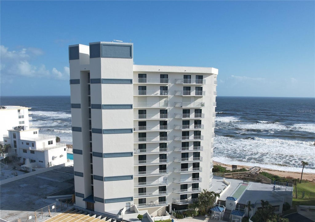 SELLERS WILL PAY THE FIRST SIX MONTHS OF THE HOA FEES! Welcome to "Surf's Up," a stunning, fully renovated 1-bedroom, 2-bathroom condo owned by a sculptor, located on the no-drive beach of south New Smyrna Beach. This exquisite unit boasts breathtaking panoramic Atlantic Ocean views from a private balcony, perfect for enjoying ocean sunrises and even space launches. The custom kitchen features solid maple cabinets, quartz countertops, and a cast iron sink with ocean views. Recent upgrades include a 2024 HVAC system, 2024 new water heater, with bespoke touches like a coral dining table and marble-top breakfront. The spacious primary bedroom has its own private lanai overlooking the pool and ocean, furnished with a new king-size bed and a walk-in closet. The en suite bathroom showcases a large, glass-enclosed walk-in shower with Italian chrome fixtures, a rain shower head, custom cabinetry, and a grey quartz countertop with dimmable lighting. A full-size washer and dryer add convenience, while the second full bathroom features a unique red Andalusian marble counter with a whimsical round mirror and an extra shower, perfect for guests. Plus, enjoy two beach bikes and surf toys stored securely in the gated parking garage—everything you need to embrace the ultimate beachside lifestyle!