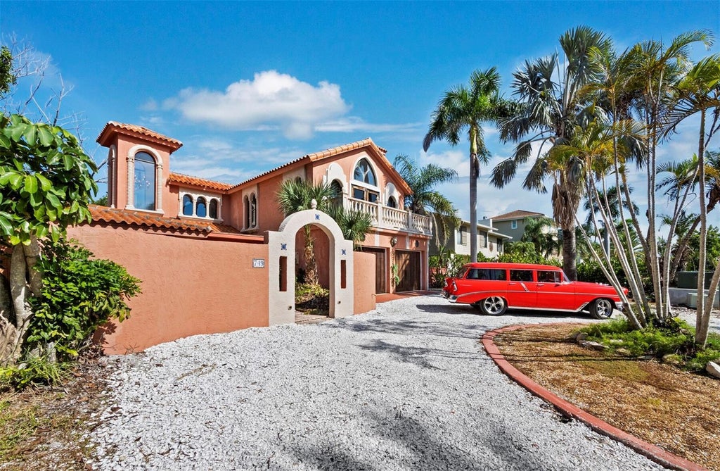 An extraordinary opportunity awaits the next visionary owner of this spacious waterfront Mediterranean-style home. Whether you choose to renovate the current home or build your new dream home, it is ideally located on a wide canal with no fixed bridges to the Gulf of Mexico. A day out on the water is right out of your back door! It is just a short stroll to the pristine beach in the highly desirable north end of Longboat Key. This is where luxury living meets the relaxed charm of coastal living. The home was damaged in the storms but was remediated and drywall was replaced. It will need flooring, a new kitchen and two bathrooms, but it features 3 bedrooms and 3 baths, and offers abundant space to recreate your perfect waterfront retreat. A distinctive arched entryway welcomes you to a private front courtyard. Upon entering through the beautifully carved wooden door, you are greeted by an abundance of natural light that highlights the unique architectural details, with a scenic view of the sparkling canal beyond. The first floor hosts a spacious open plan living and dining area, the kitchen, two bedrooms, and two bathrooms, along with a large utility room that could easily serve as a fourth bedroom or additional living space. A grand staircase leads to the primary bedroom, which boasts a luxurious marble ensuite with a jacuzzi tub and breathtaking views of the canal below. This exceptional room features a cathedral ceiling with exposed wooden beams, a gorgeous oak floor with intricate inlays, a wood-burning fireplace, and a balcony overlooking the private courtyard. It is a true sanctuary that could easily be transformed into a second expansive living area. Close to multiple restaurants, the fabulous St.Regis Resort and the world renowned St. Armands Circle…..and just a couple of bridges away from the cultural epicenter of downtown Sarasota……this is a rare offering to come and make your own!
