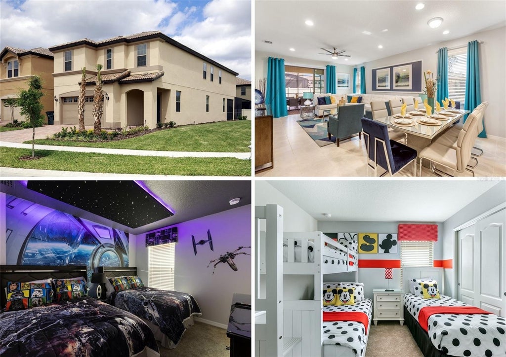 Turnkey 7-Bedroom Corner-Lot Vacation home in Windsor at Westside – Just 15 Minutes from Disney! This 7-bedroom, 5.5-bath retreat is thoughtfully designed for unforgettable getaways and strong rental performance. Boasting an expansive open-concept layout, the home features multiple living areas, a game room, and custom-themed bedrooms that delight guests of all ages. Each floor includes a primary suite, providing added convenience and flexibility for multi-generational stays. The modern kitchen is equipped with granite countertops, stainless steel appliances, and generous prep space—perfect for entertaining family and friends. Step outside to your private screened-in pool and spa, complete with a covered lanai for shaded outdoor dining. Situated on a desirable corner lot, the property enjoys added privacy and a more open view. Every bedroom is tastefully decorated, with several showcasing fun and immersive themes that enhance the vacation experience and drive rental appeal. As part of the Windsor at Westside community, you and your guests will enjoy access to exceptional resort-style amenities, including a grand clubhouse, resort pool, lazy river, splash zone, fitness center, sports courts, and more. The HOA fee conveniently covers lawn care, cable, internet, and valet trash service—making this home a truly low-maintenance investment. Whether you're seeking a high-performing short-term rental property or a second home for family getaways, this property checks every box. Don’t miss the opportunity to own a piece of Central Florida’s vacation magic!