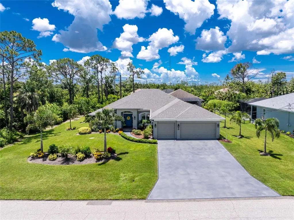 Welcome to your private paradise in Rotonda West, FL! This beautifully maintained 4-bedroom, 3-bathroom home PLUS an office or den is perfectly situated on a double lot in the desirable Rotonda Lakes community, offering rare privacy and lush tropical landscaping—including a full wall of mature areca palms in the backyard. Step inside and be wowed by the spacious, tiled interior, enhanced by a tray ceiling in the great room and thoughtfully chosen accent colors that add warmth and style throughout. The kitchen is a chef’s dream, featuring wood cabinetry, granite countertops, a stylish backsplash, breakfast bar, and a cozy dining nook. French doors lead you out to an amazing screened outdoor living space complete with a heated swim spa/pool 4 foot depth (swim or workout for powerful exercise and therapy features with resistance swimming) and upgraded, durable lanai screening—perfect for year-round enjoyment. Cooling shades and solar torch lighting add ambiance, while the backyard’s natural beauty and privacy create your own personal retreat. The primary ensuite is a true sanctuary, with double wood vanities, granite counters, a garden tub, and elegant crown molding. Crown molding is also featured in the great room, gourmet kitchen, and office/den. The three-car garage offers plenty of space, and the freshly painted driveway and walkway with decorative trim boost curb appeal. Meticulously upgraded by the current owners, this home includes: enhanced landscaping and irrigation system, commercial-grade gutters wrapped around the home, whole-house generator plug, hurricane shutters installed on the front door, impact windows and remaining exterior doors (existing prior to current ownership), security cameras and outdoor lighting for peace of mind. Located just minutes from Rotonda West’s golf courses and the pristine beaches of Boca Grande and Manasota Key, this showplace home combines comfort, elegance, and exceptional value for the discerning buyer. Don’t miss your chance to own this slice of Florida paradise! Some items in the home can be sold as a separate part of the contract - please ask for details!