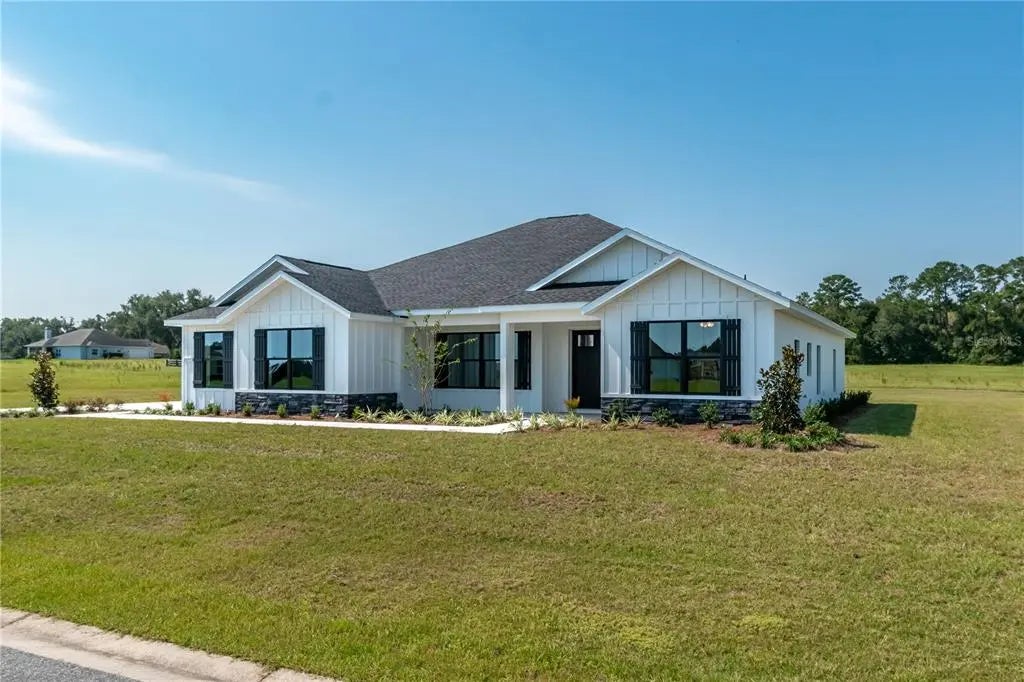 Completed in 2024, this brand new home is an exciting option for those looking for their slice of Central Florida! Situated within the quiet community of Irish Acres, this Glyndale construction features plenty of curb appeal with large yards, professional landscaping, and a stunning exterior that features stone accents, a cozy covered front porch, and a french-door entrance. Offering a total of 4-bedrooms and 3-baths, the home was carefully designed with an open, split-bedroom floor plan that spans over 2,300 sq ft. High ceilings, large windows, and tasteful finishes run throughout, providing a sophisticated and inviting ambience. Located just off the foyer, the living room is light and bright with sliding glass doors out to the rear patio and plenty of space. Directly open to the living room is the kitchen, which features a tray ceiling accent, a stainless steel range, microwave, and dishwasher, lots of cabinet storage, tiled backsplash, a large center island with breakfast bar. A formal dining area and an informal breakfast nook are located on either side of the kitchen, making it easy to enjoy a quiet cup of coffee or host a more formal dinner party without fuss. The primary suite is an exquisite option for relaxing after a long day with a large layout, direct patio access, and a private en-suite bathroom complete with dual vanities, a large garden tub, glass-door walk-in shower, and a huge walk-in closet. On the other side of the home are the remaining three bedrooms– a large secondary bedroom and bath that is separated from the other bedrooms via a small pocket hallway with patio access, and two bedrooms that share the remaining bathroom. At the back of the home is the large, covered patio which offers plenty of space to enjoy the year-round sunshine and comes equipped with ceiling fans for added air-flow. Additional features to note include a large laundry room and the side-entry 2 car garage with a large driveway. Irish Acres is a lovely community located in the northern region of Ocala, just a short drive from a variety of shopping and dining options and just 15 minutes from the Ocala Downtown Square. Gainesville is a scenic 40 drive along 301 and 441, making this a wonderful option for those needing access to both Ocala and Gainesville. If you’re looking for a new home with distinction, this stunning home is an incredible option to consider!