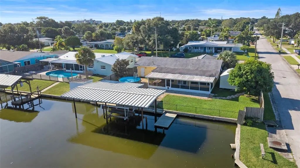 Waterfront Paradise with $5,000 Buyer Credit! Located on a deep, navigable canal to Sykes Creek, this immaculate concrete block home is a dream for boaters, entertainers, and AirB&B investors! Enjoy breathtaking sunrises and sunsets from your oversized covered dock with lift, dining area, and room to relax while watching dolphin and manatee. The bright, open layout features two spacious master suites: one with a remodeled bath and a bonus room perfect for a game or family room. New luxury vinyl plank flooring (2025) in all bedrooms and Florida room. Main master includes a walk-in closet and direct Florida room access. Outdoors, enjoy a fenced corner lot, large screened patio, and private above-ground pool in a lush tropical setting. Community waterfront park with tennis, basketball, and playground. No HOA! Centrally located in Merritt Island, ideal for full-time living, winter escape, or vacation rental!