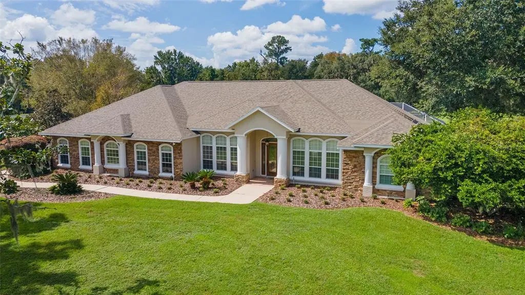 This stunning property nestled on 3.41 acres within a gated, horse-friendly community in SE Ocala combines elegance, comfort, and the opportunity to have your 4 legged friends right in your own backyard! Between the main home (3506 sq ft) and the second home (1645 sq ft) there is a combined living space of 5151 sq ft. The main home features 4 bedrooms and 3.5 baths, designed with an open floor plan that includes a family room centered around a charming stone fireplace, that flows seamlessly into the kitchen with wood cabinets and a center island surrounded by granite countertops. A cozy breakfast space just off the kitchen looks out to the newly remodeled pool and lanai. Inside, you’ll find wood flooring throughout the main living areas. This home also has a spacious primary suite, complete with two walk-in closets featuring built-ins, and a primary bath with travertine tile, dual vanities, a soaking tub and a separate shower. Best of all, it has direct access to the pool and lanai. All 3 guest bedrooms are good sized and have ample closet space. The main home also includes a formal living and dining room, plus a separate office/study. Accessible from multiple points in the home, the newly remodeled screen enclosed pool with waterfall and water features is surrounded by new pavers and covered lanai, making it the perfect space for relaxing and entertaining. Pool has electric heater and salt system. Adding to the charm, is an additional 1,645 sq ft detached home, which is currently set up as an entertainment space, complete with a built-in bar, spacious living area, and a separate theater room. This versatile area could easily be transformed into a guest house, with a half bath already in place. Recent updates include fresh paint inside and out, a new roof in 2022, updated air-conditioning units (5 ton in 2021 and 2.5 ton in 2018), along with new duct work. Equestrians will appreciate the 4-board fencing, making this property as horse-friendly as it is beautiful. This is the perfect spot for those seeking luxury and functionality in a picturesque country setting.